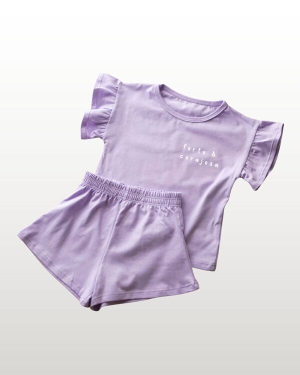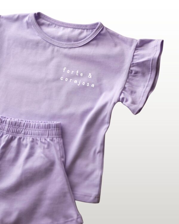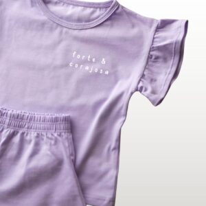 Feito em malha de algodão penteada, este conjunto combina conforto e estilo para as pequenas. Oferece suavidade e durabilidade, ideal para o dia a dia. Com babados delicados nas mangas e uma estampa que transmite positividade, este conjunto é perfeito para destacar a essência do cuidado e da proteção.
